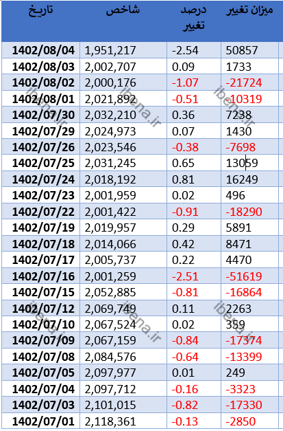 به گزارش پایگاه خبری نقدی شاخص کل بازار سرمایه امروز (شنبه ۶ آبان) ۵۰ هزار و ۸۵۶ واحد افت کرد و در کانال یک میلیون و ۹۵۱ واحدی ایستاد. بدین ترتیب در این روز شاخص کل بازار سرمایه ۲.۵۴ درصد کاهش یافت.