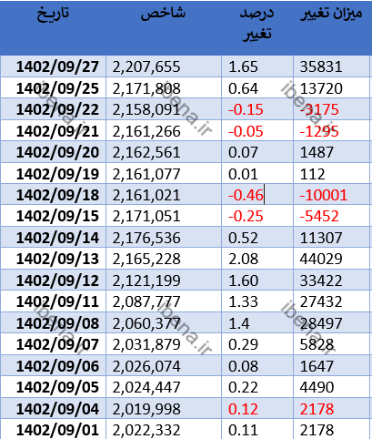 به گزارش پایگاه خبری نقدینه ، شاخص کل بازار سرمایه امروز (دوشنبه ۲۷ آذر) ۳۵ هزار و ۸۳۱ واحد رشد کرد و در کانال دو میلیون ۲۰۷ هزار واحدی ایستاد. بدین ترتیب در این روز شاخص کل بازار سرمایه ۱.۶۵ درصد تقویت شد.