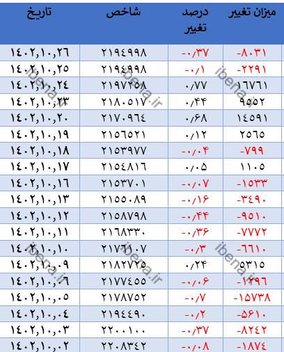 به گزارش پایگاه خبری نقدینه ، شاخص کل بازار سرمایه امروز (سه شنبه ۲۶ دی) ۸ هزار و ۳۱ واحد افت کرد و در کانال دو میلیون ۱۸۶ هزار واحدی ایستاد. بدین ترتیب در این روز شاخص کل بازار سرمایه ۰.۳۷ درصد ریزش کرد.