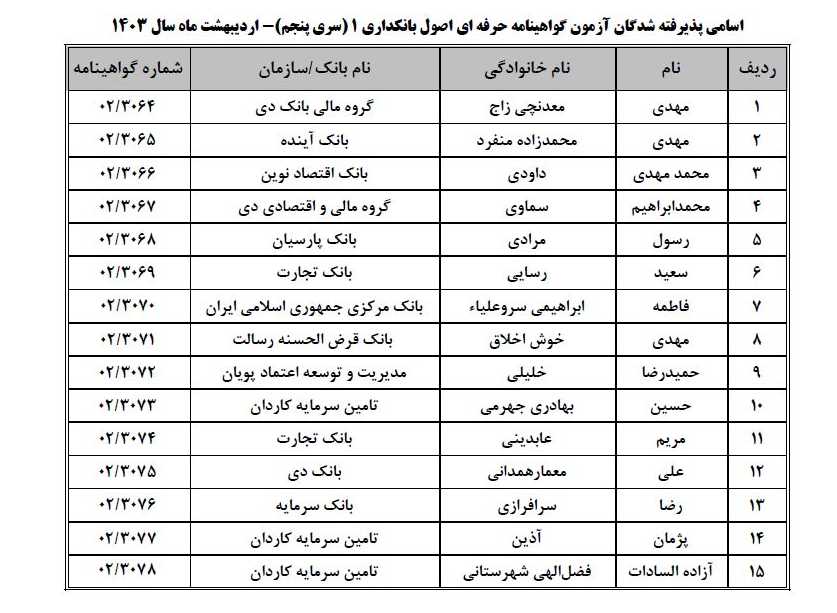 به گزارش پایگاه خبری نقدینه ؛ پیرو برگزاری پنجمین آزمون «اصول بانکداری ۱»، اسامی پذیرفته شدگان آزمون مذکور به شرح فهرست زیر اعلام میشود: