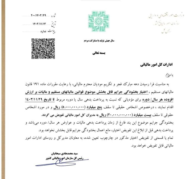 به گزارش پایگاه خبری نقدینه ، به مناسبت فرا رسیدن دهه مبارک فجر و تکریم مودیان مالیاتی با رعایت مقررات ماده ۱۹۱ قانون مالیاتهای مستقیم، اختیار بخشودگی جرایم قابل بخشش موضوع قوانین مالیاتهای مستقیم و مالیات بر ارزش افزوده هر سال و دوره برای مؤدیانی که برای پرداخت بدهی سال یا دوره مربوط تا تاریخ ۲۹ اسفند ۱۴۰۳ اقدام کنند، در خصوص اشخاص حقیقی تا سقف ۵۰۰ میلیون تومان و در مورد اشخاص حقوقی تا سقف ۲ میلیارد تومان به مدیران کل امور مالیاتی تفویض میشود.