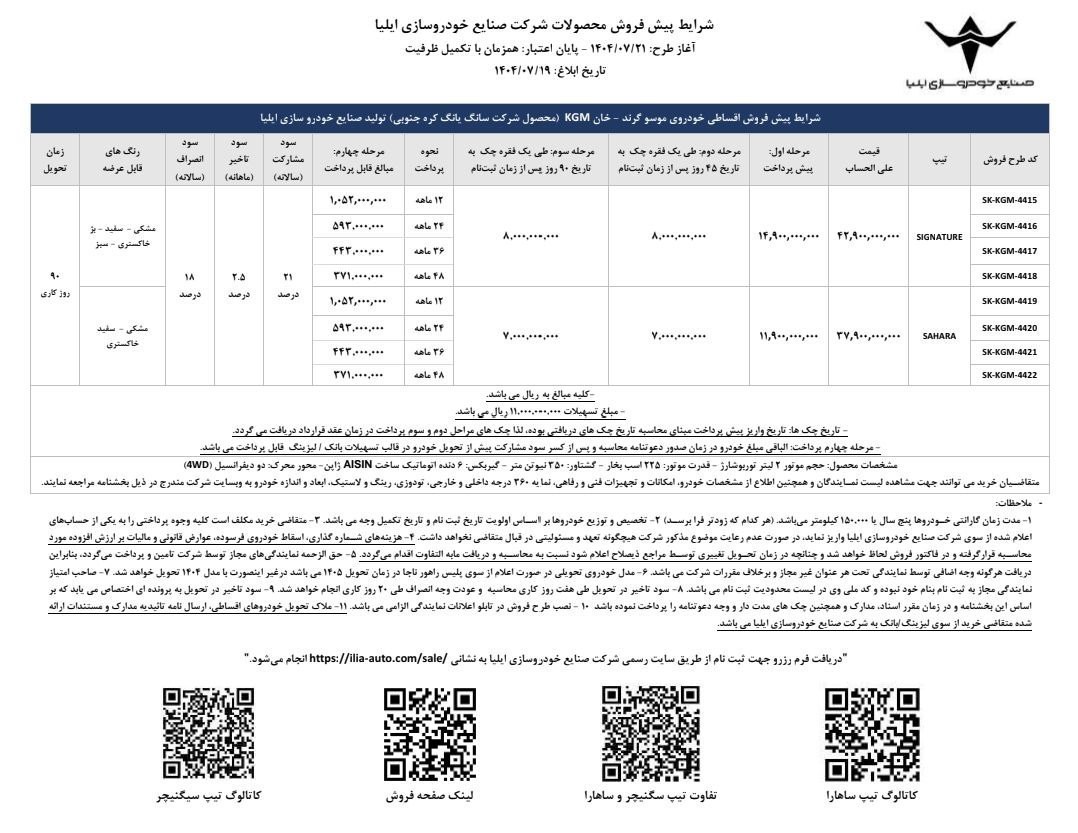 در این طرح فروش، دو مدل ساهارا و سیگنیچر به ترتیب با قیمت تقریبی 37 میلیارد و 900 میلیون ریال و 42 میلیارد و 900 میلیون ریال عرضه میشوند.