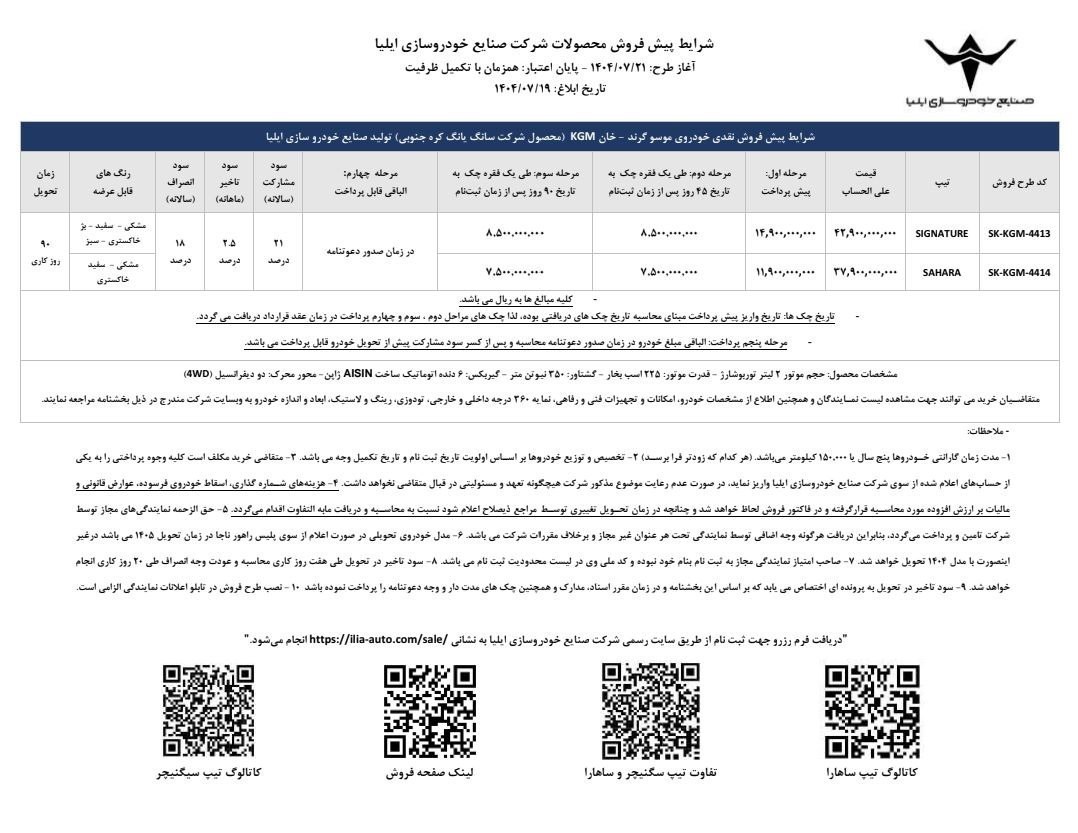 علاقهمندان برای شرکت در این طرح فروش میتوانند از روز دوشنبه 21 مهرماه 1404 تا تکمیل ظرفیت، با مراجعه به وبسایت رسمی فروش محصولات صنایع خودروسازی ایلیا به آدرس https://ilia-auto.com/sale/ برای ثبتنام اقدام کنند.