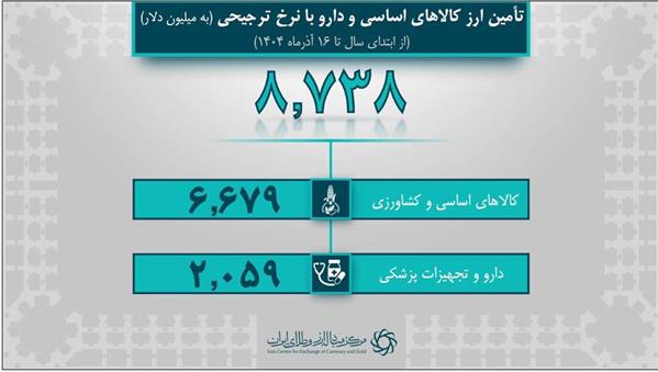 به گزارش روابط عمومی بانک مرکزی از این میزان، ۸ میلیارد و 738 میلیون دلار به واردات کالاهای اساسی و دارو شامل 6 میلیارد و 679 میلیون دلار برای نهادهها و بخش کشاورزی و 2 میلیارد و 59 میلیون دلار برای واردات دارو و تجهیزات پزشکی تخصیص یافته است.