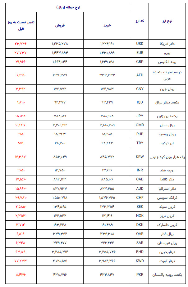نرخ رسمی حوالهای تمامی ارزها و تغییرات آن بر حسب ریال به تفصیل در جدول زیر آمده است.