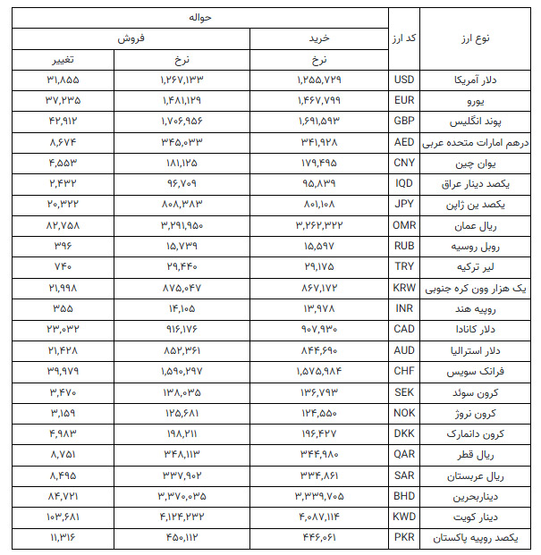 | دلار آمریکا | USD | ۱۲۵۵۷۲۹ | ۱۲۶۷۱۳۳ | -۵,۲۰۳ |